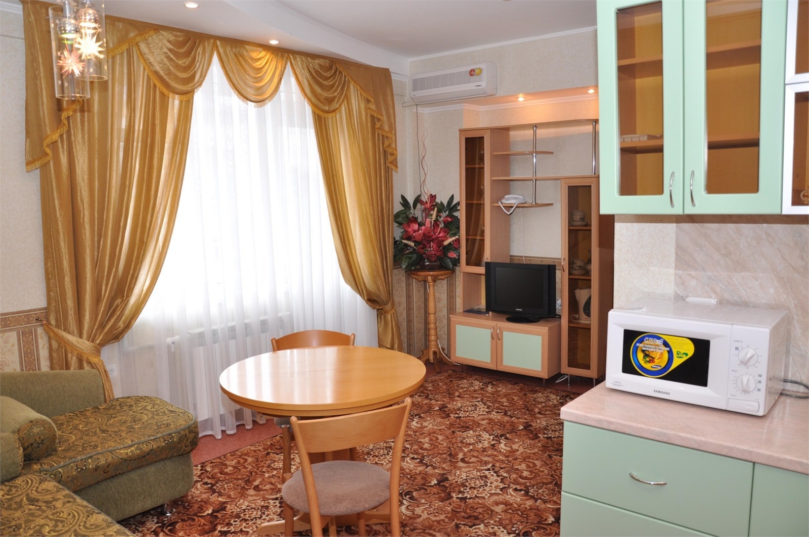 Площадь номера - 27,1 кв.м. 4 осн. места. 1 доп. место. Балкон. Кухня. Мебель: вешалка, диван раскладной, зеркало, кровати односпальные, кровать двуспальная, прикроватные тумбочки, столик журнальный, столик туалетный, стулья, шкаф. Оборудование: микроволновая печь, набор посуды, сейф, сплит-система, телевизор, холодильник, электрочайник. Санузел: с душевой кабиной, тапочки, туалетные принадлежности, фен, халат. Сервис: смена полотенец (по требованию), смена постельного белья (ежедневно), уборка номера (ежедневно), услуги внутренней телефонной связи.