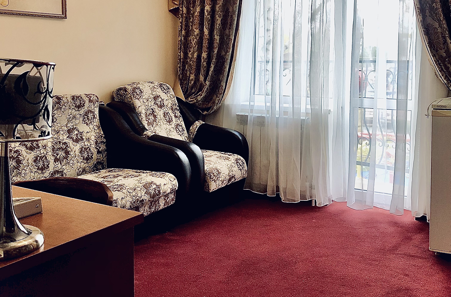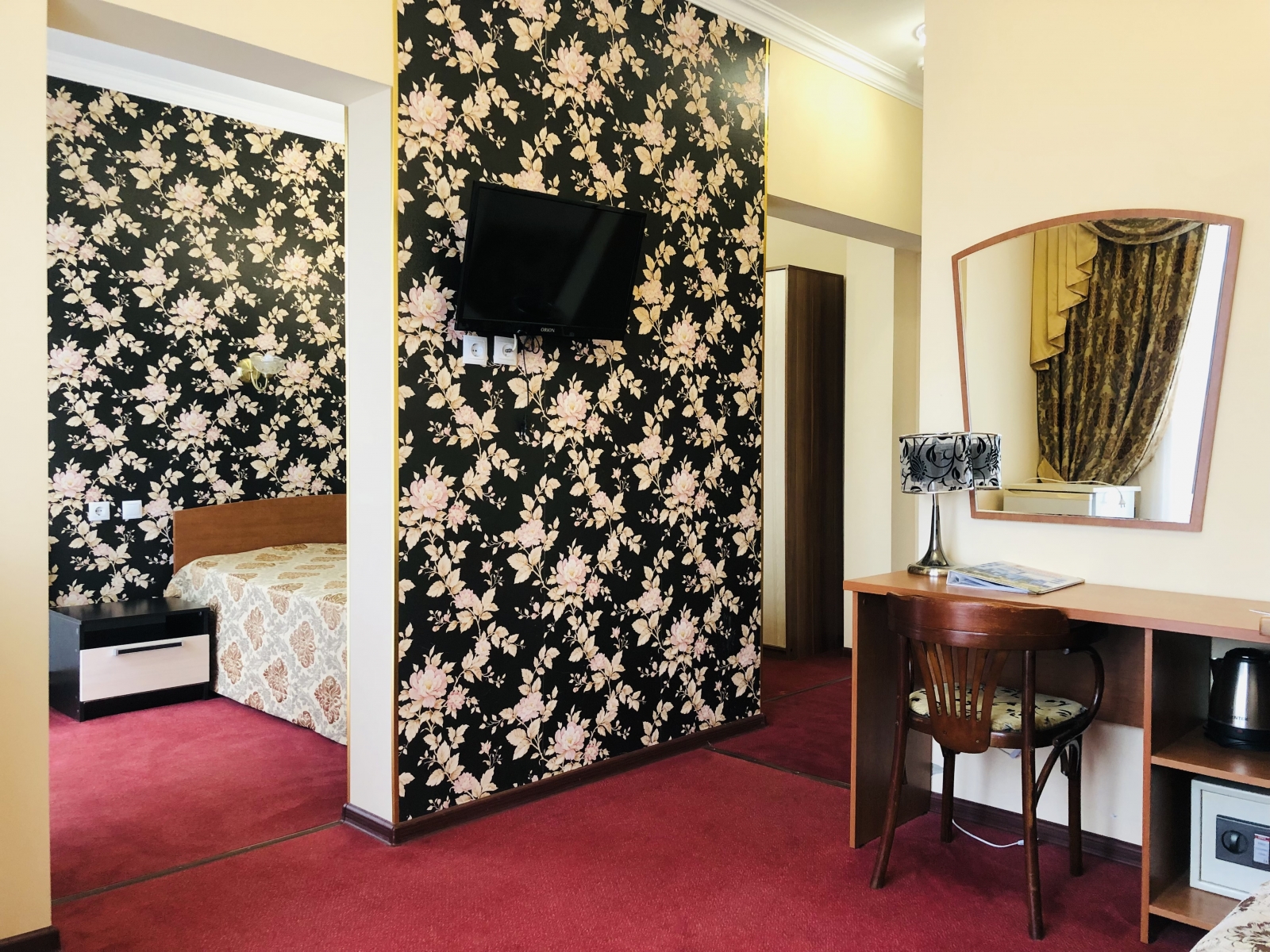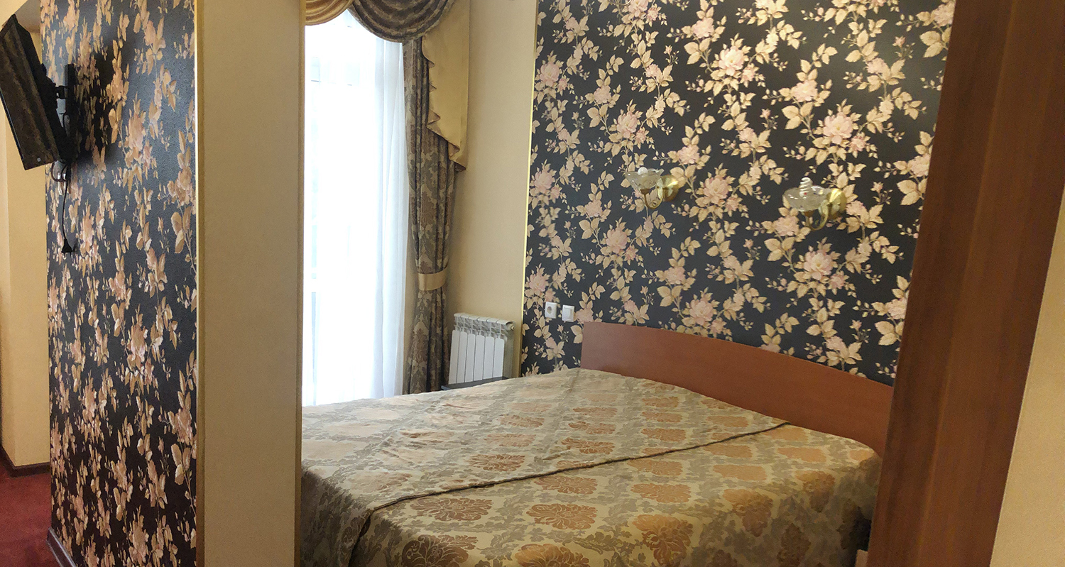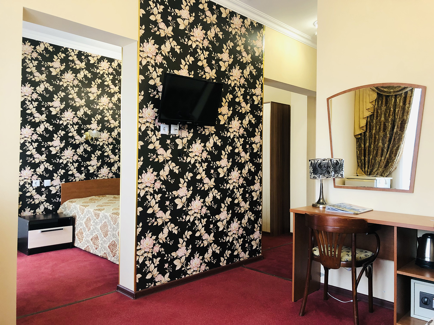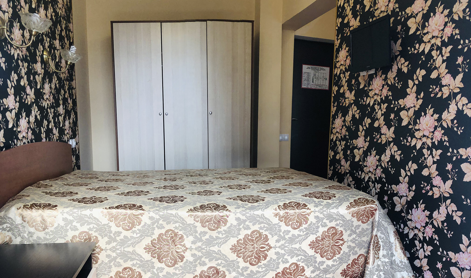 Площадь номера - 26 кв.м. 2 осн. места. 2 доп. места. Балкон. Мебель: вешалка, диван, зеркало, кровать двуспальная, прикроватные тумбочки, стол, стулья, шкаф. Оборудование: мини-холодильник, набор посуды, сплит-система, телевизор. Санузел: с душем, туалетные принадлежности. Сервис: смена полотенец (по требованию), смена постельного белья (1 раз в 5 дней), уборка номера (ежедневно).