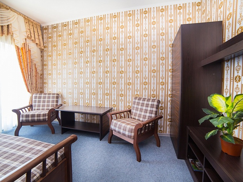 Площадь номера - 26 кв.м. 2 осн. места. 2 доп. места. Балкон. Мебель: вешалка, диван, зеркало, кровати односпальные /одна двуспальная кровать, прикроватные тумбочки, стол, стулья, шкаф. Оборудование: мини-холодильник, набор посуды, сплит-система, телевизор. Санузел: с душем, туалетные принадлежности. Сервис: смена полотенец (по требованию), смена постельного белья (1 раз в 5 дней), уборка номера (ежедневно).