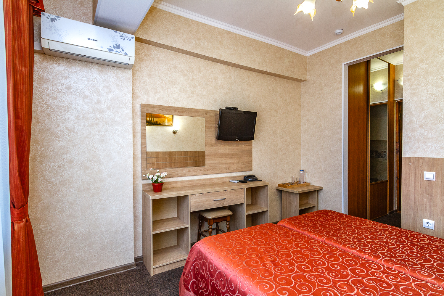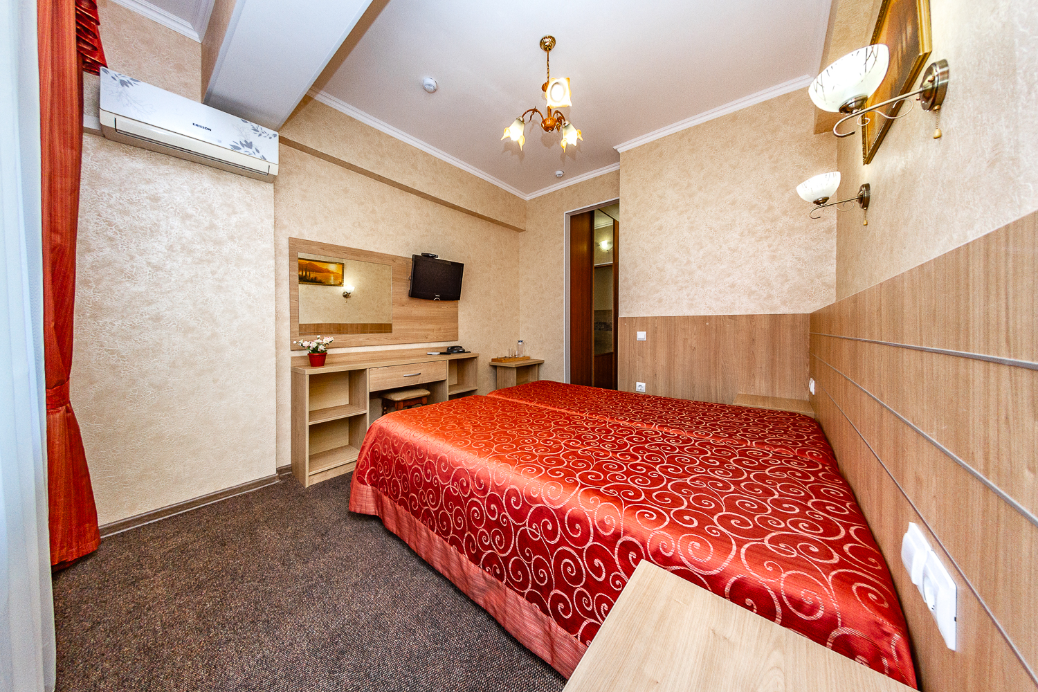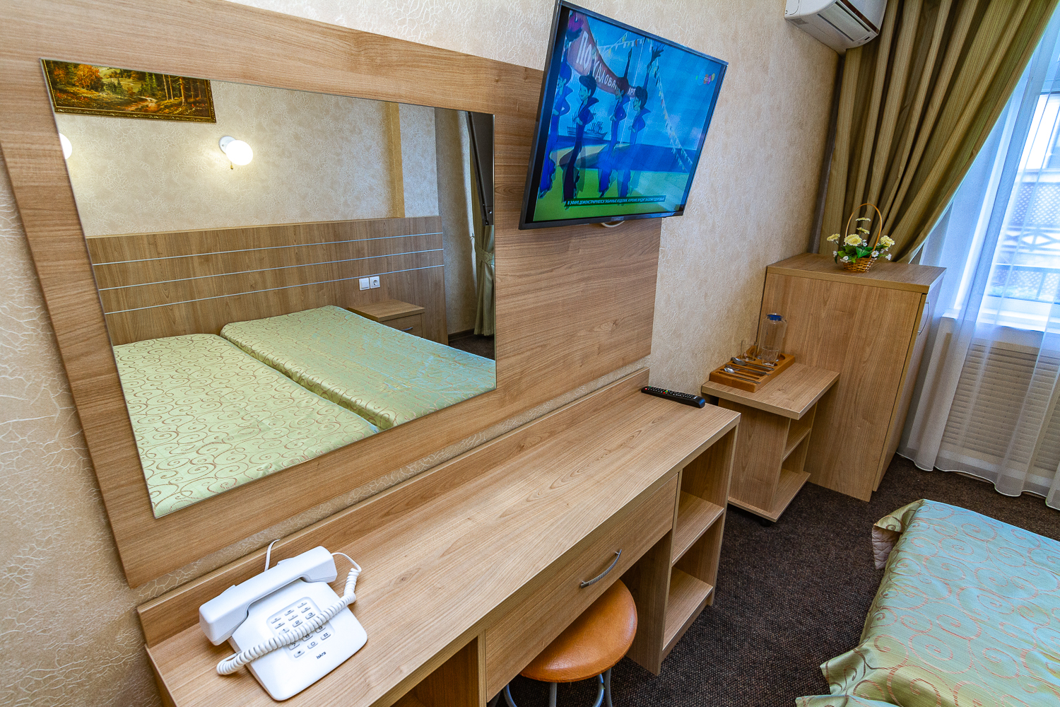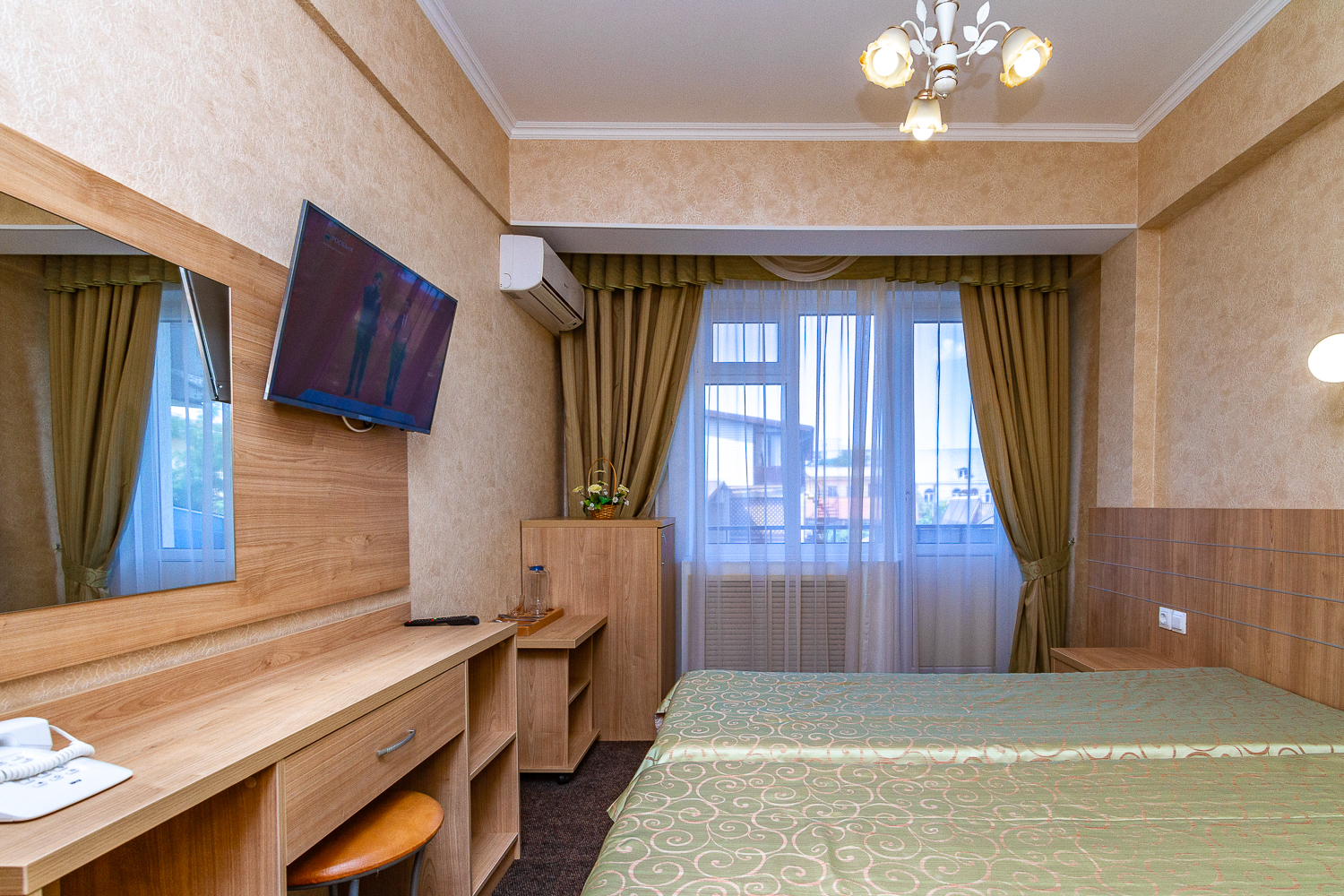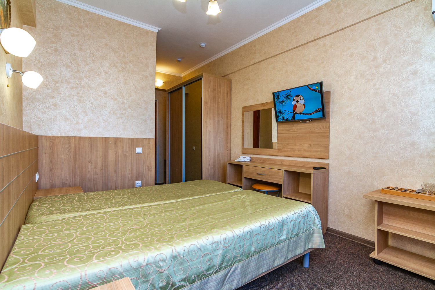 Площадь номера - 15 кв.м. 2 осн. места. Балкон. Мебель: вешалка, зеркало, кровати односпальные, прикроватные тумбочки, стол, стулья, шкаф. Оборудование: мини-холодильник, набор посуды, сплит-система, телевизор. Санузел: с душевой кабиной, туалетные принадлежности. Сервис: Wi-Fi бесплатно, смена полотенец (по требованию), смена постельного белья (1 раз в 5 дней), уборка номера (ежедневно), услуги внутренней телефонной связи.